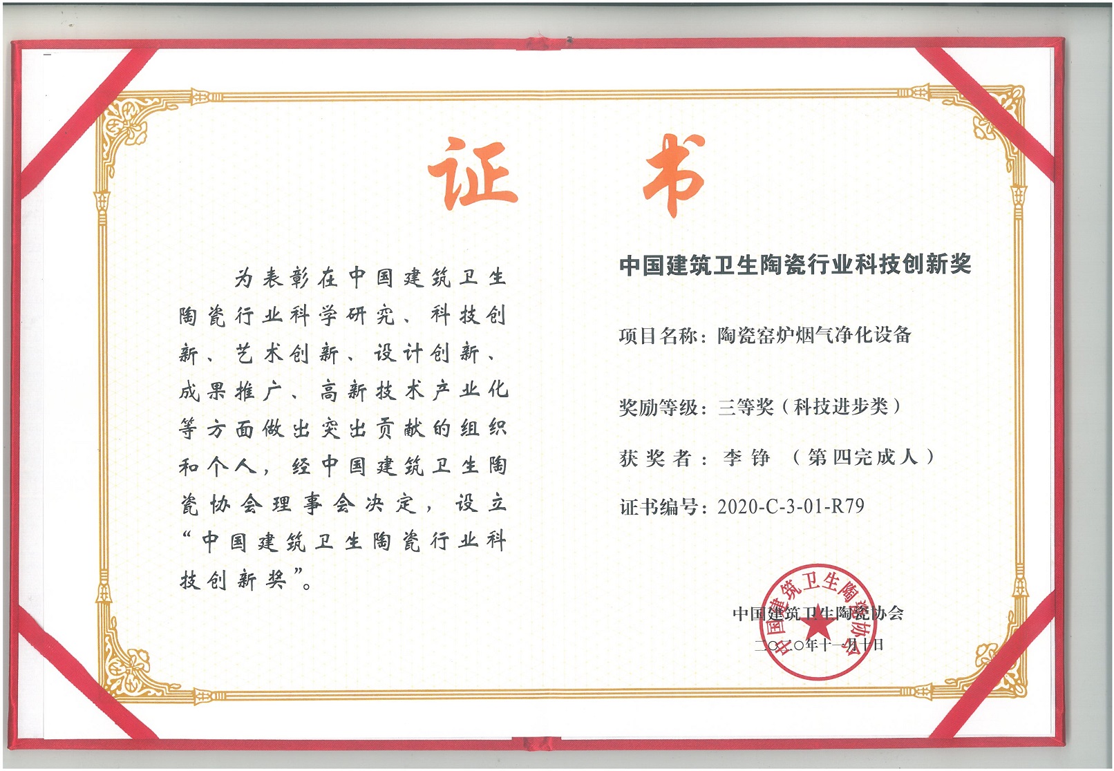 Sinid Environmental Protection's Honor -建筑衛生陶瓷行業科技創新三等獎(李錚)