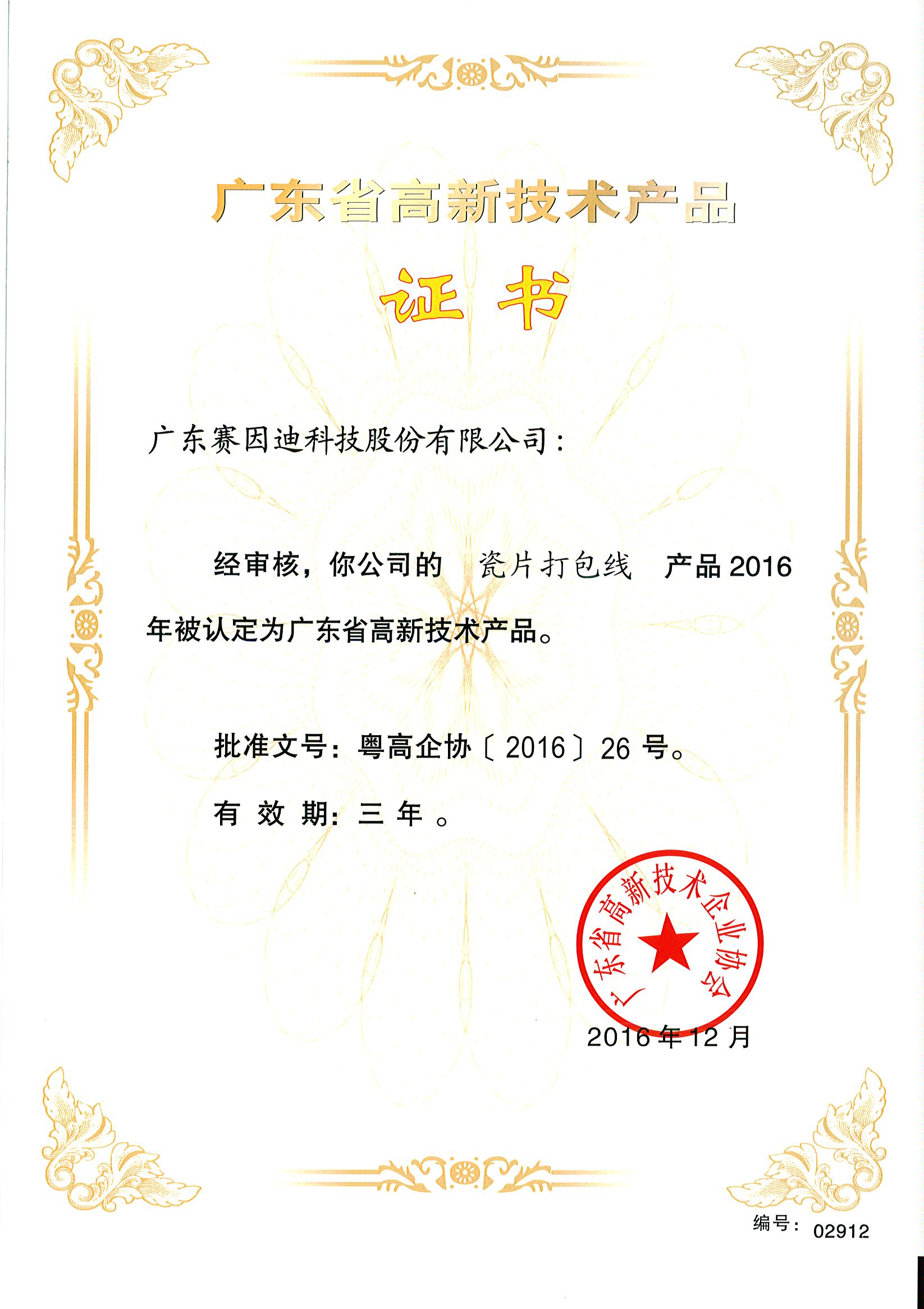 Sinid Technology's Honor-廣東省高新技術(shù)證書-瓷片打包線