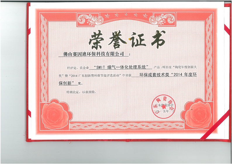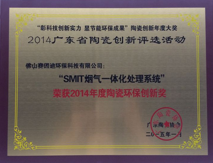 Sinid Environmental Protection's Honor -2014廣東陶瓷協會環保成套技術“2014年度環保創新獎”