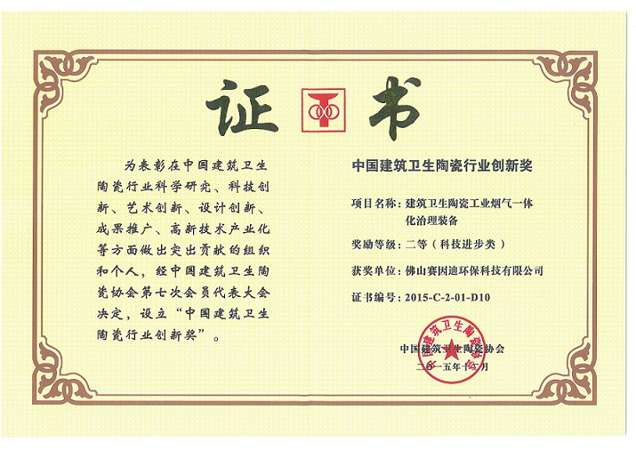 Sinid Environmental Protection's Honor -2015中國建筑衛生陶瓷行業協會科技進步二等獎