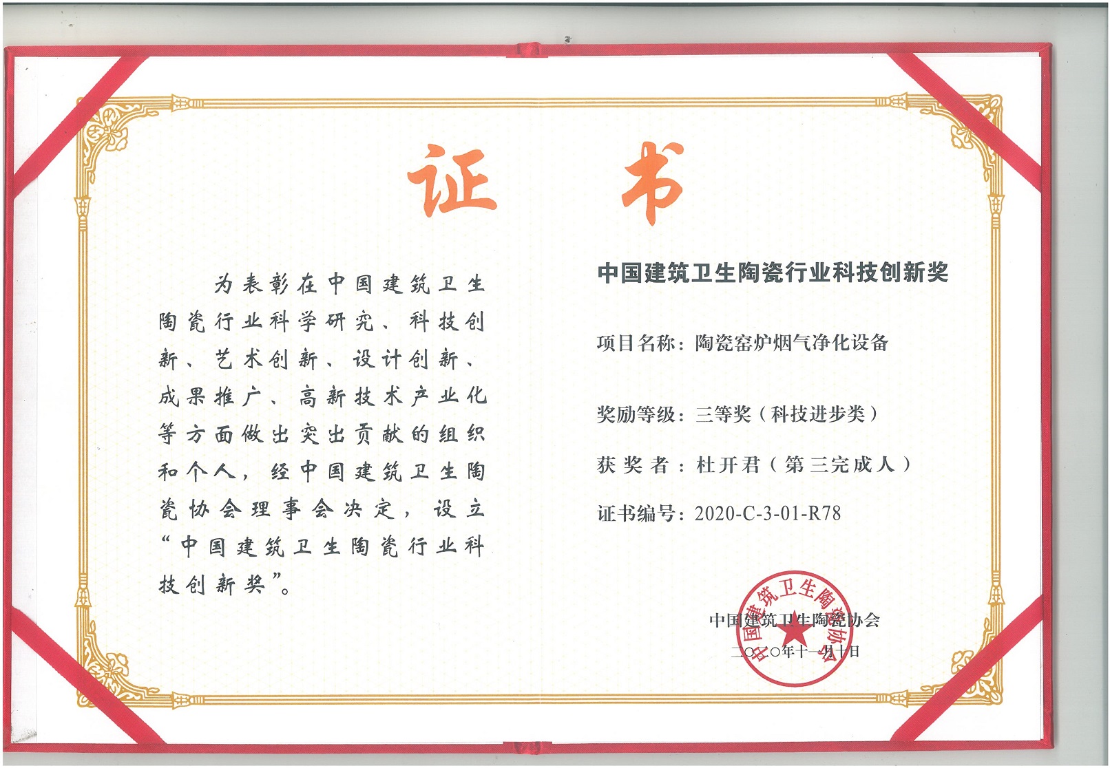 Sinid Environmental Protection's Honor -建筑衛生陶瓷行業科技創新三等獎(杜開君)