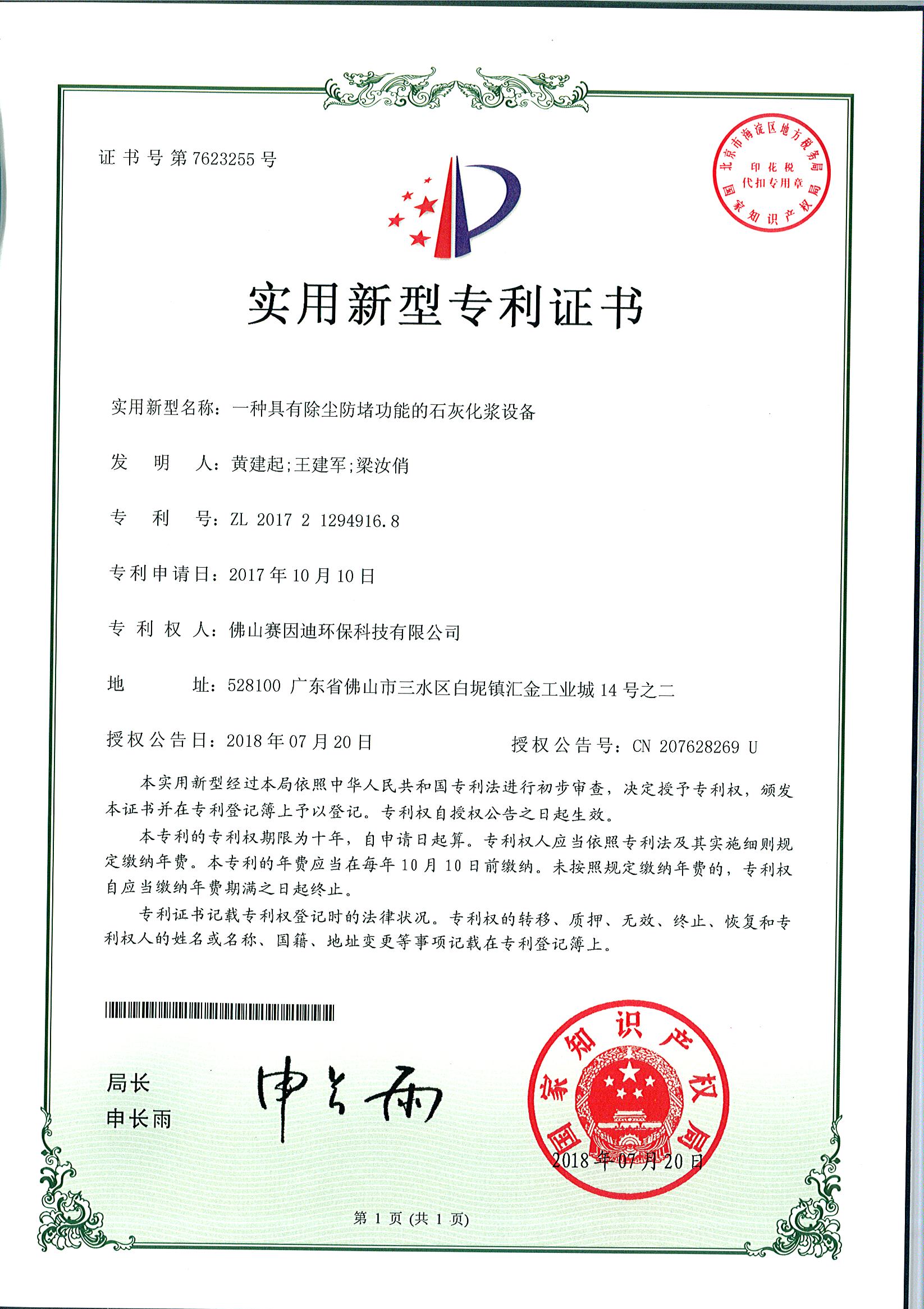 Sinid Environmental Protection's Patents-一種具有防塵防堵功能的石灰化漿設備