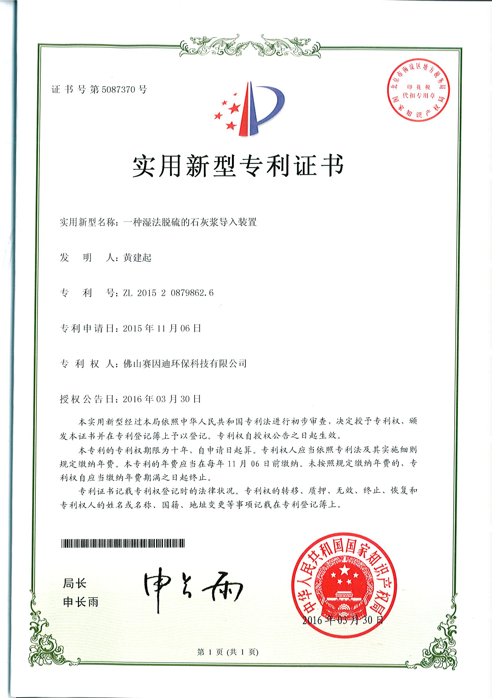 Sinid Environmental Protection's Patents-一種濕法脫硫的石灰漿導入裝置