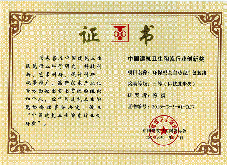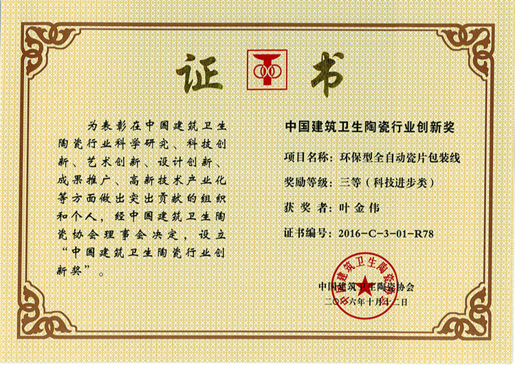 賽因迪科技榮譽-環保型全自動瓷片包裝線(葉金偉)中國建筑衛生陶瓷行業創新獎