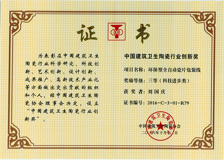 賽因迪科技榮譽-環保型全自動瓷片包裝線(劉國慶)中國建筑衛生陶瓷行業創新獎