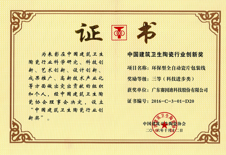 賽因迪科技榮譽-環保型全自動瓷片包裝線(楊揚)中國建筑衛生陶瓷行業創新獎
