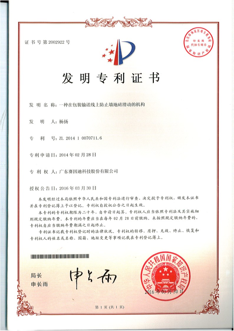 賽因迪科技專利-一種在包裝輸送線上防止墻地磚滑動的機構